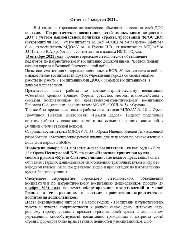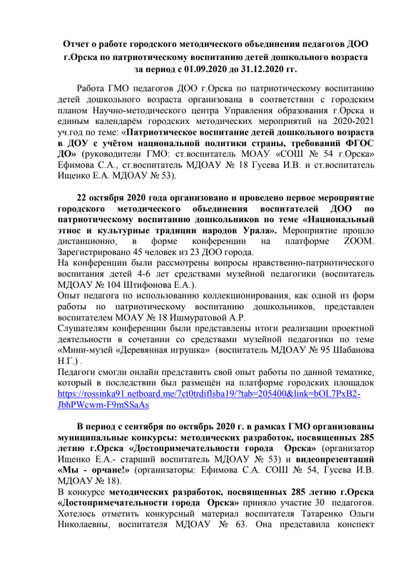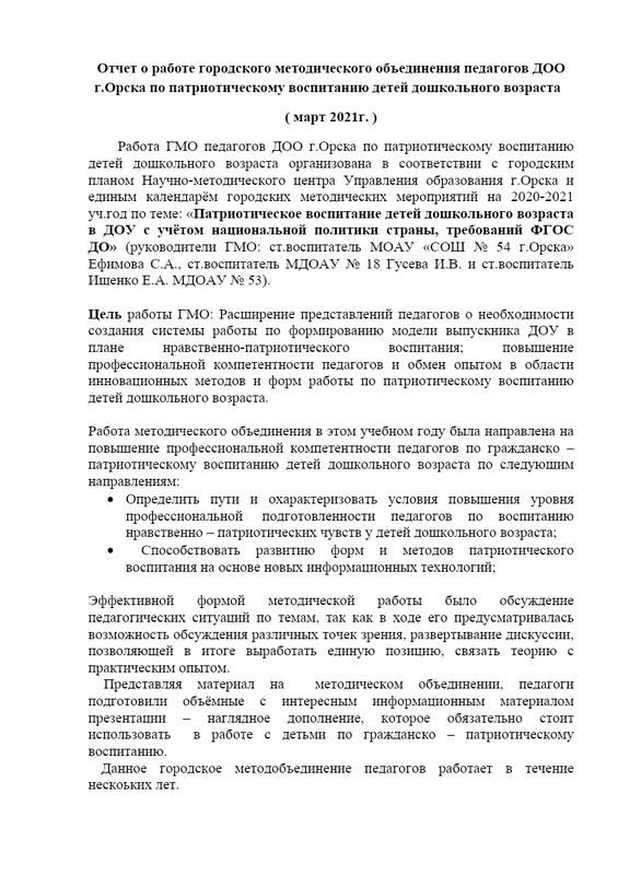 Отчет работы городского метод объединения воспитателей ДОО г.Орска по патриотическому воспитанию детей дошкольного возраста за 2020 год