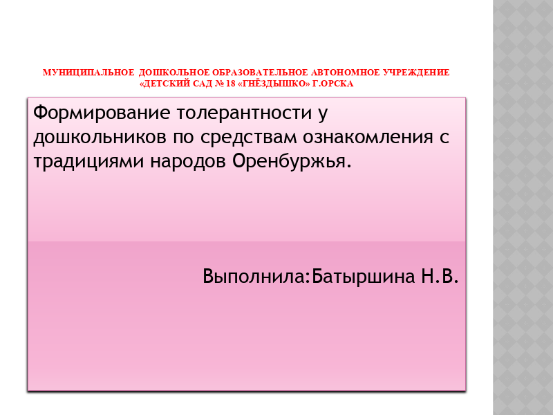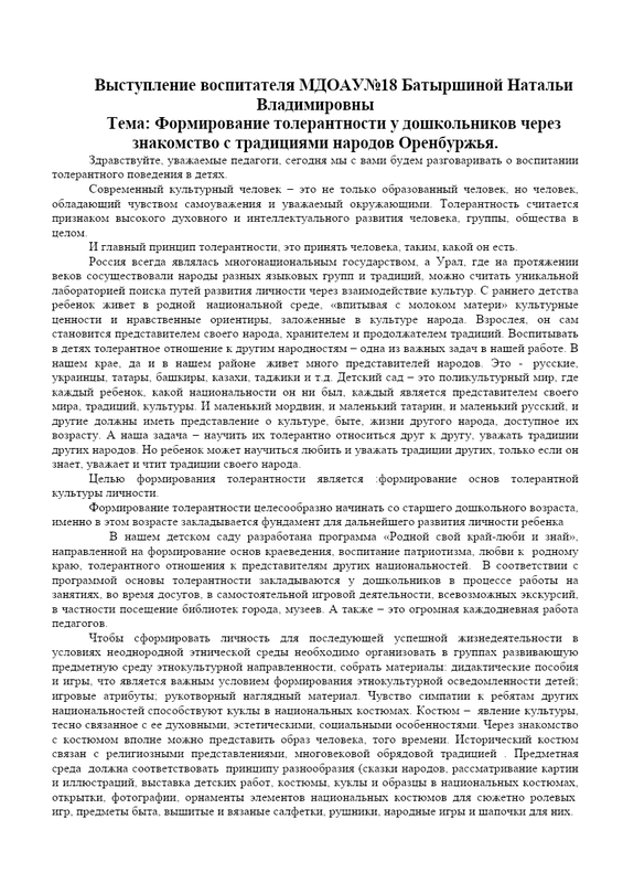 Тема: Формирование толерантности у дошкольников через знакомство с традициями народов Оренбуржья
