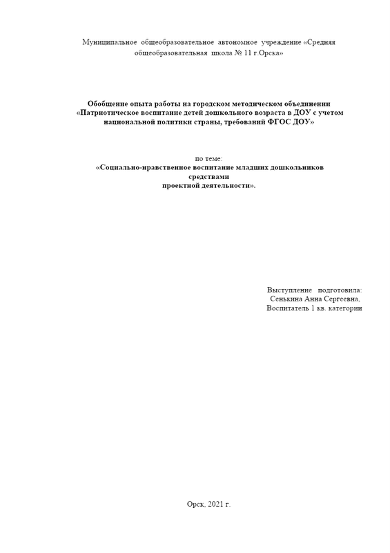 1)Формирование моральных и нравственных чувств у дошкольников посредством социальных акций и проектов (Сенькина А.С. СОШ № 11)