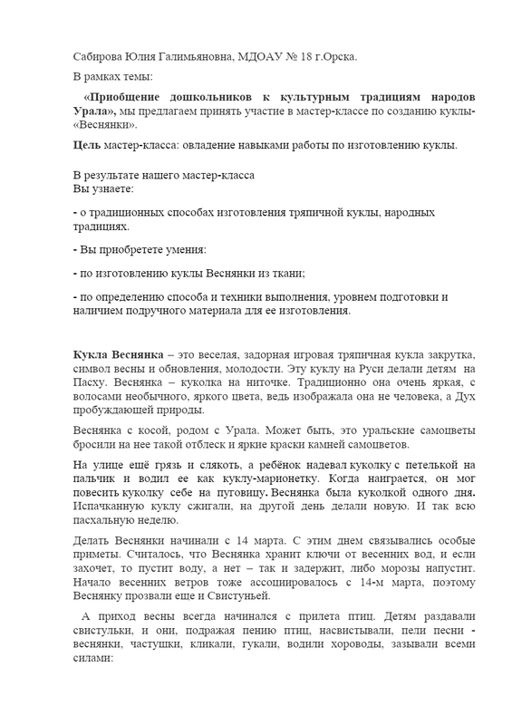 5) Приобщение дошкольников к культурным традициям народов Урала. Мастер-класс по созданию куклы-«Веснянки» (Сабирова Ю.Г. МДОАУ № 18)