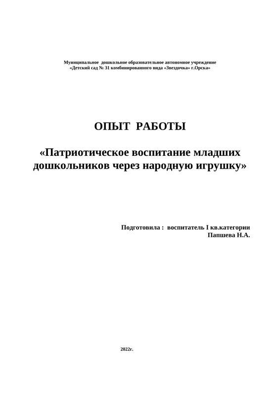 опыт работы воспитателя МДОАУ № 31 Папшевой Н.А. по теме "Патриотическое воспитание младших дошкольников через народную игрушку"