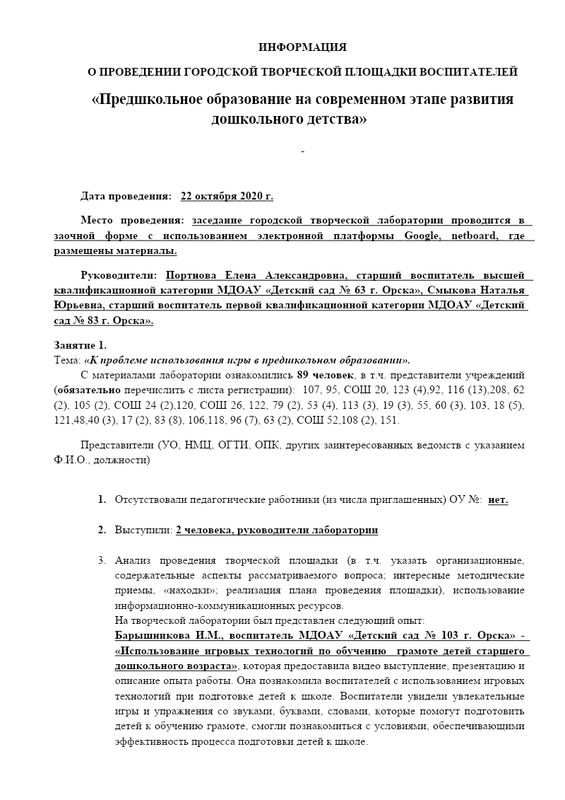 Информация о проведении городской творческой лаборатории по предшкольной подготовке занятие 1 от 22.10.2020