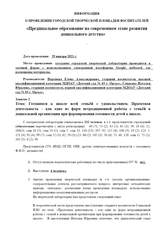 Информация о проведении городской творческой лаборатории по предшкольной подготовке занятие 2 от 29.01.2021