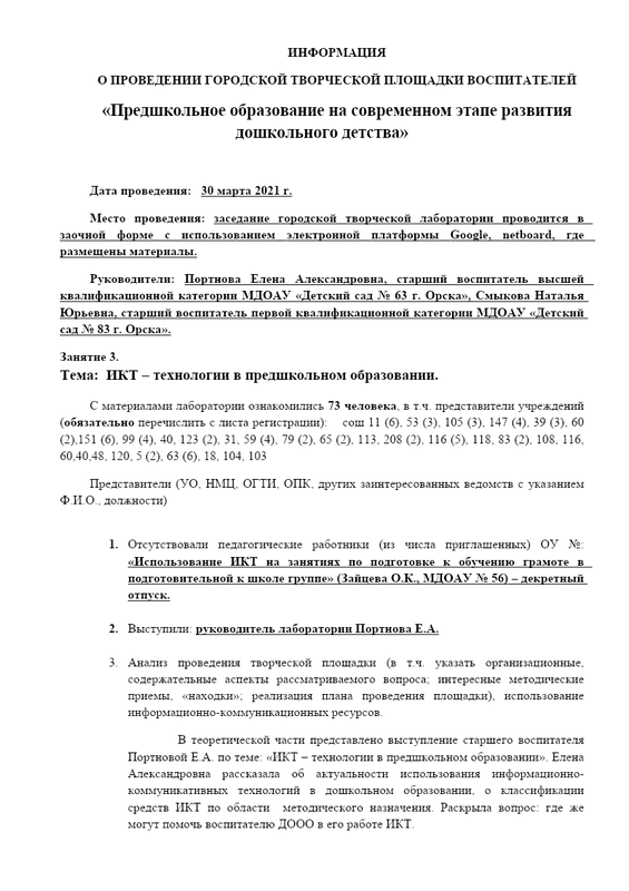Информация о проведении городской творческой лаборатории по предшкольной подготовке занятие 3 от 30.03.2021