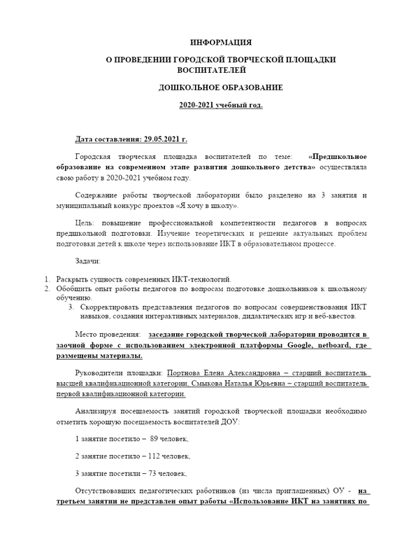 Информация о результатах городской лаборатории 2020 2021 предшкола Портнова Смыкова
