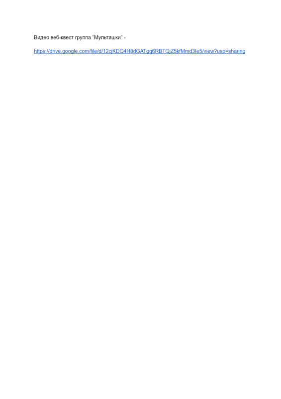 Видео веб-квест группа “Мультяшки” - https://drive.google.com/file/d/12cjKDQ4H8dGATgq6RBTQjZ5kfMmd3Ie5/view?usp=sharing