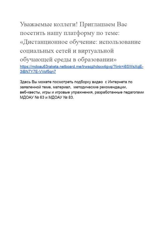 Уважаемые коллеги! Приглашаем Вас посетить нашу платформу по теме: «Дистанционное обучение: использование социальных сетей и виртуальной обучающей среды в образовании» https://mdoau63raketa.netboard.me/trwsqzhdsxx4gvq/?link=i6SWsXqE-3iBN7Y7E-VVof5qn7 Здесь Вы можете посмотреть подборку видео с ...