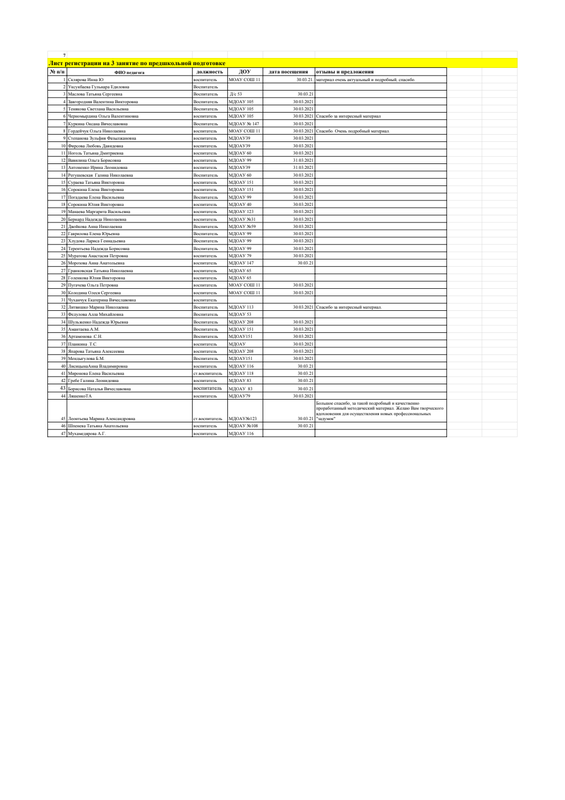 Лист1 7 Лист регистрации на 3 занятие по предшкольной подготовке № п/п,ФИО педагога,должность,ДОУ,дата посещения,отзывы и предложения 1,Склярова Инна Ю,воспитатель,МОАУ СОШ 11,30.03.21.,материал очень актуальный и подробный, спасибо. 2,Уксукбаева Гульнара Едиловна ,Воспитатель 3,Маслова Татьяна...