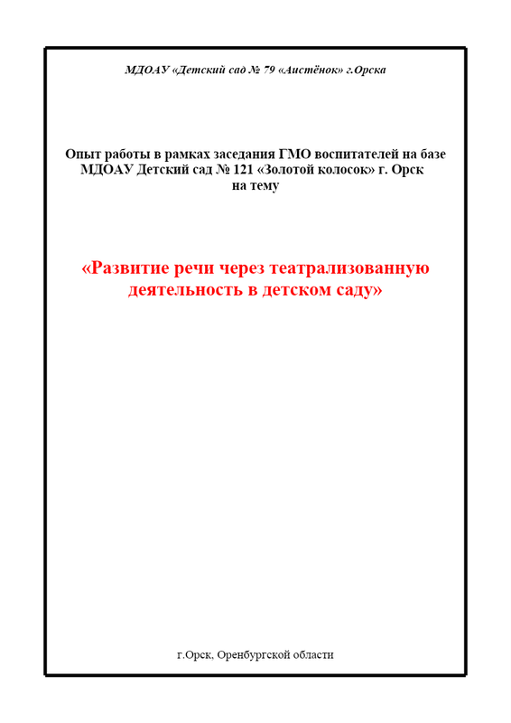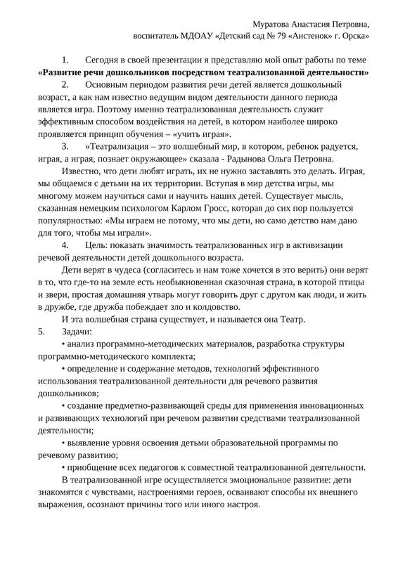 Развитие речи дошкольников посредством театрализованной деятельности. Муратова А.П..? МДОАУ №79