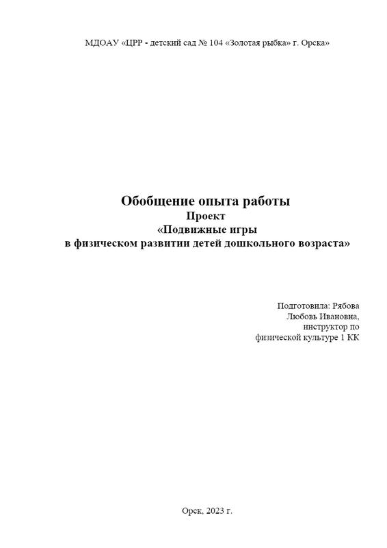 Подвижные игры в физическом развитии детей дошкольного возраста. Рябова Л.И. инструктор по физической культуре МДОАУ № 104 г. Орска
