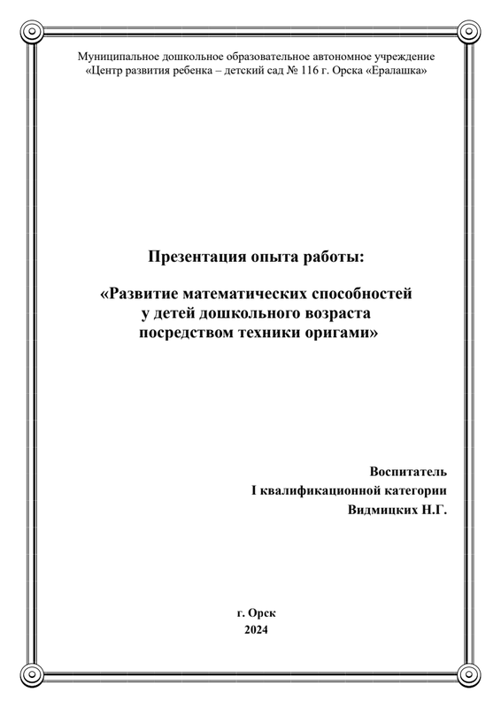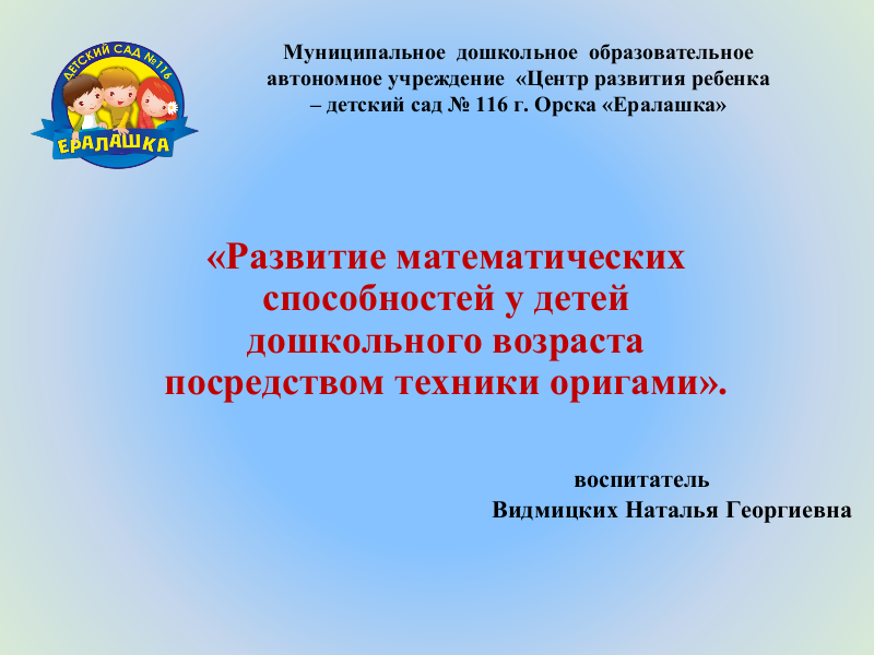 способностей у детей дошкольного возраста посредством техники оригами», Видмицких Н.Г. воспитатель МДОАУ "ЦРР - детский сад № 116 г. Орска"