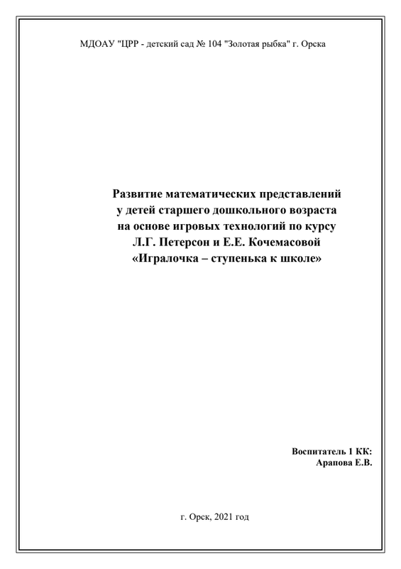 Презентация "Развитие математических представлений у детей старшего дошкольного возраста на основе игровых технологий по курсу Л.Г. Петерсон и Е.Е. Кочемасовой «Игралочка – ступенька к школе» - Арапова Е.В. МДОАУ №104