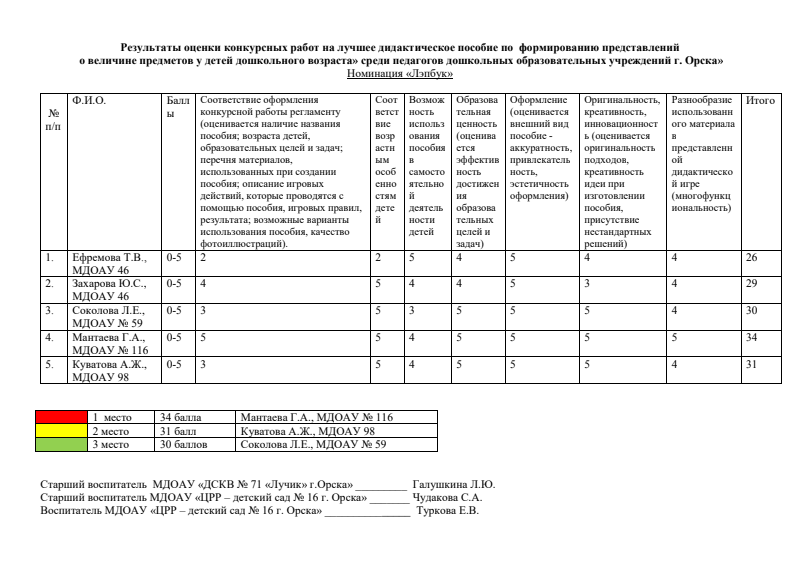 Результаты оценки конкурсных работ на лучшее дидактическое пособие по формированию представлений о величине предметов у детей дошкольного возраста» среди педагогов ДОУ г. Орска»