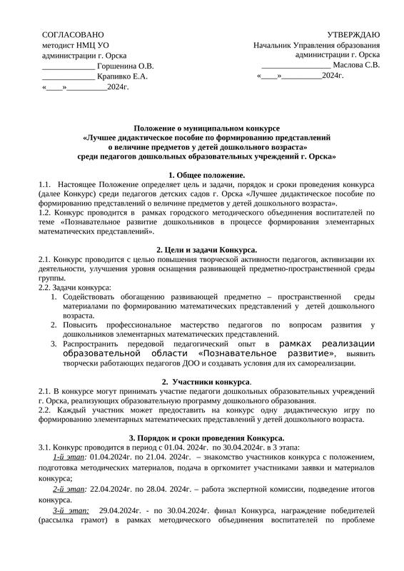 2024г. - Положение о муниципальном конкурсе «Лучшее дидактическое пособие по формированию представлений о величине предметов у детей дошкольного возраста» среди педагогов дошкольных образовательных учреждений г. Орска»